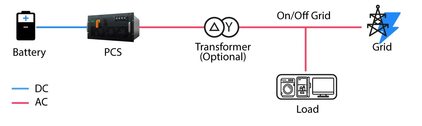 Das Batteriespeichersystem wandelt gespeicherte Energie intelligent in nutzbaren Strom um. Die in der Batterie gespeicherte Energie liegt als Gleichstrom (DC) vor und wird über das Power Conversion System (PCS) in Wechselstrom (AC) umgewandelt. Dieser kann direkt an Verbraucher weitergeleitet oder ins öffentliche Netz eingespeist werden. Ein optionaler Transformator ermöglicht die Anpassung an höhere Netzspannungen - ideal für gewerbliche oder industrielle Anwendungen. Dabei lässt sich das System sowohl netzgebunden (On-Grid) als auch netzunabhängig (Off-Grid) betreiben. Im Off-Grid-Modus übernimmt es bei Netzausfällen zuverlässig die Stromversorgung. Das Ergebnis: Eine intelligente, flexible Energieverteilung - für maximale Eigenverbrauchsoptimierung, Netzeinspeisung oder sichere Notstromversorgung.